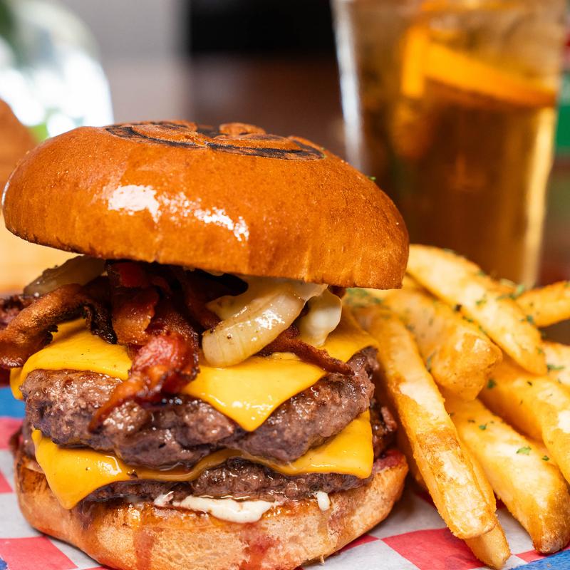 Double beef burger with cheddar, bacon, caramelized onions, house mayo, and fries.