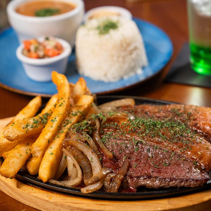 Juicy top sirloin steak grilled with onions, served with rice, beans, fries, farofa and vinaigrette.